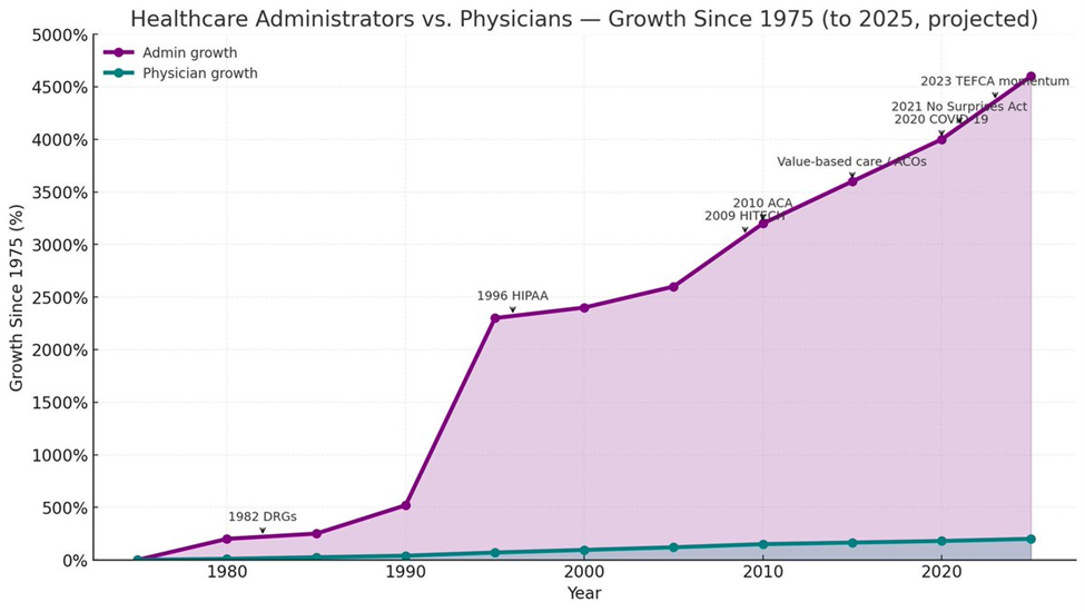 So, what can be done now? One suggestion is a conditional extension of the subsidies combined with measures to reduce costs, based on an understanding of why costs are outrageous. The graph below shows the enormous increase in administrators, and the legislation associated with it.